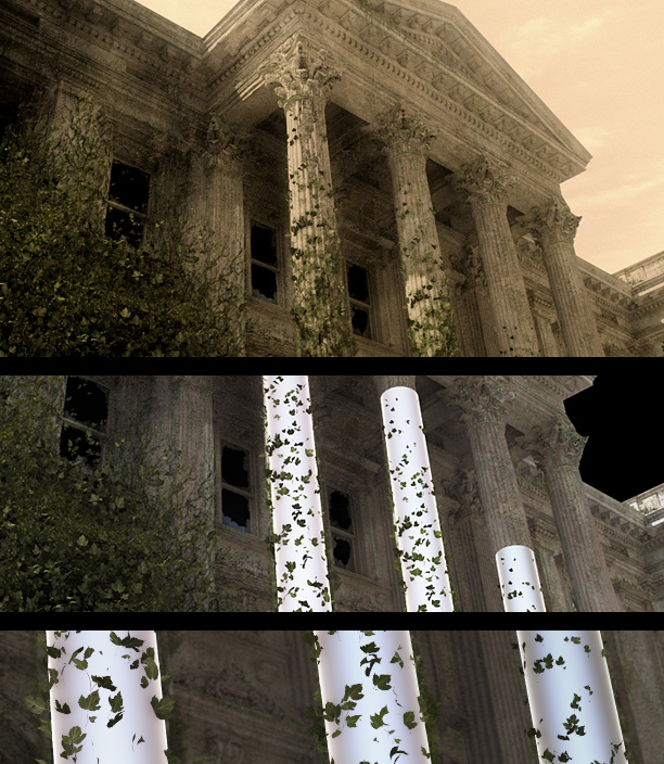 What is an apocalypse without the ruined courthouse?! We wanted to make the emptiness and destruction less depressing so we leaned towards a more green and lush vegetation. One of the shows Matte Painters helped give the building a nice worn out look with IVY and then I used our plug-in Element 3D to animate some of the leaves and Ivy. The trick here was getting the ivy to wrap around the pillars and to obscure the plants as they intersect the concrete. The white pillars here show the matte geometry that was used to cut the edges and cast ambient occlusion on the surface. I also used the animation engine toprogressivelyanimate the leaves outward.