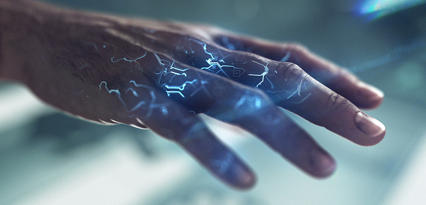 This hand shot was rendered in entirely in Element 3D from a high quality hand model. The digital circuits were created in After Effects and mapped to the hand using a second copy of Element 3D on top of the original to give it a glowing effect.