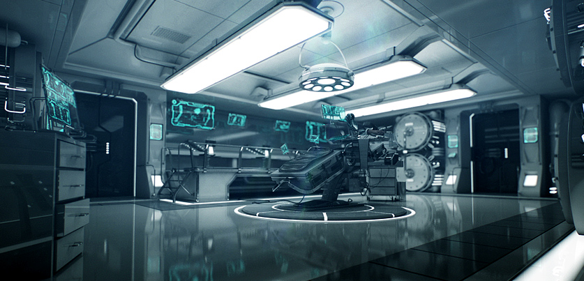 This room was created in 3DS max with help from the Video Copilot modelling team via Stefan & Alex. I compositied in After Effects with the Z-pass to add depth of field. The shot included some really cool high-tech screens as well as detailed medical equipment from the future! Luckily we had a render farm because this shot took about 8 minutes per frame to render.