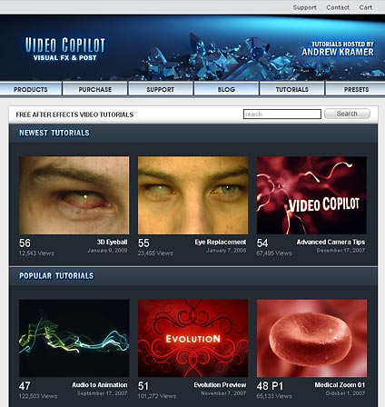 2) View all tutorials link would also be nice for visitors. My first reaction before scrolling below the fold was that you got rid of the other tutorials. I thought maybe once you've shown people how to pull the skin up around their eye (http://www.videocopilot.net/tutorials.html?id=92), you know, it just makes the other tutorials look weak.