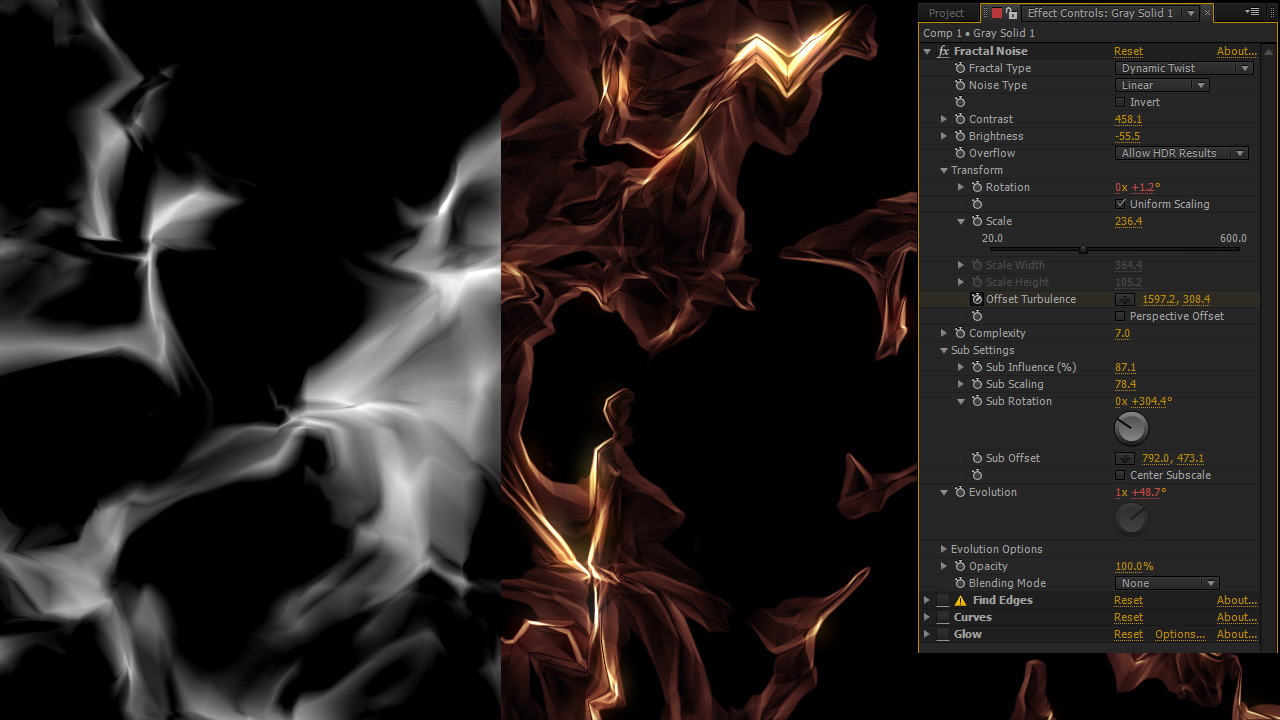 I was experimenting with some interesting energy fields and I discovered a fun combination of effects. I used the standard fractal noise effect to create a basic turbulent map and then applied a Find Edges effect on top. I added some color correction and a glow to give it more punch and even animated the evolution settings. Feel free to play around with the fractal noise settings with the Find Edges effect applied and see what other interesting looks you can discover.