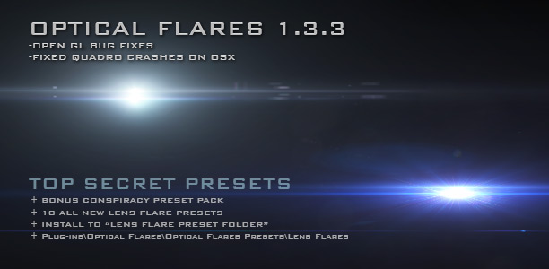 Optical Flares 1.3.3 has been released along with a free bonus pack of presets. As some of you may know we are in development on Optical Flare 2.0 and we were able to fix some bugs and we wanted to make these fixes available now!