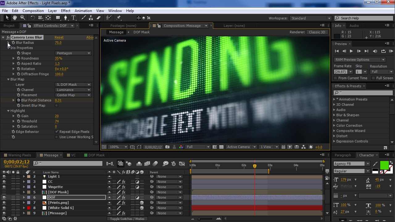 Here is a funexperiment I created to simulatecool LCD Pixel effects using built-in plug-ins only! It uses the Camera Lens Blur effect along with a depth map to create realistic DOF.