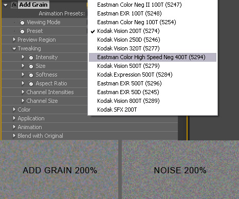 What I like to do is create a grain video loop that I can place on top of my video with the overlay transfer mode. Similar to our free fast film grain preset found here, except the quality of the grain is much better.