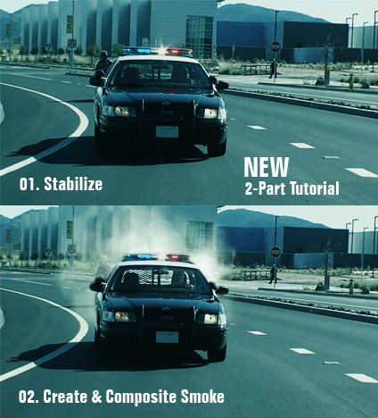 In this new 2-part tutorial you will learn a great method for stabilizing footage in After Effects that smooths the result rather than freezes the tracking center. We will also create smoke flying behind a police car, which is as fun as it sounds.