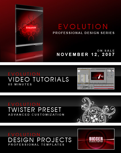 Evolution is a collection of high-quality decorative design elements for motion graphics work. This product is going on sale November 12th, 2007.