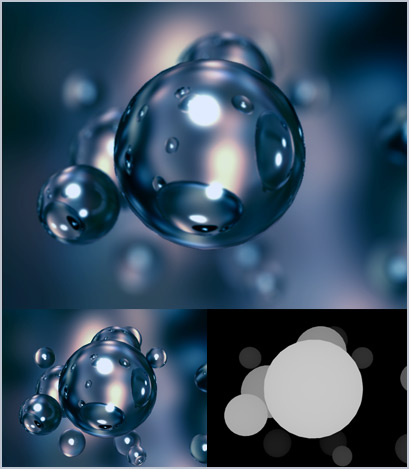 Depth of Field is a wonderful thing. Many 3D programs can render this, but it takes a deathly long time. After Effects has a plugin called Lens Blur that does a nice job of taking a depth matte and using it to generate depth of field. Most 3D programs allow you to render a depth matte which is basically a black and white image, where white shows things close to the camera and black is far away.