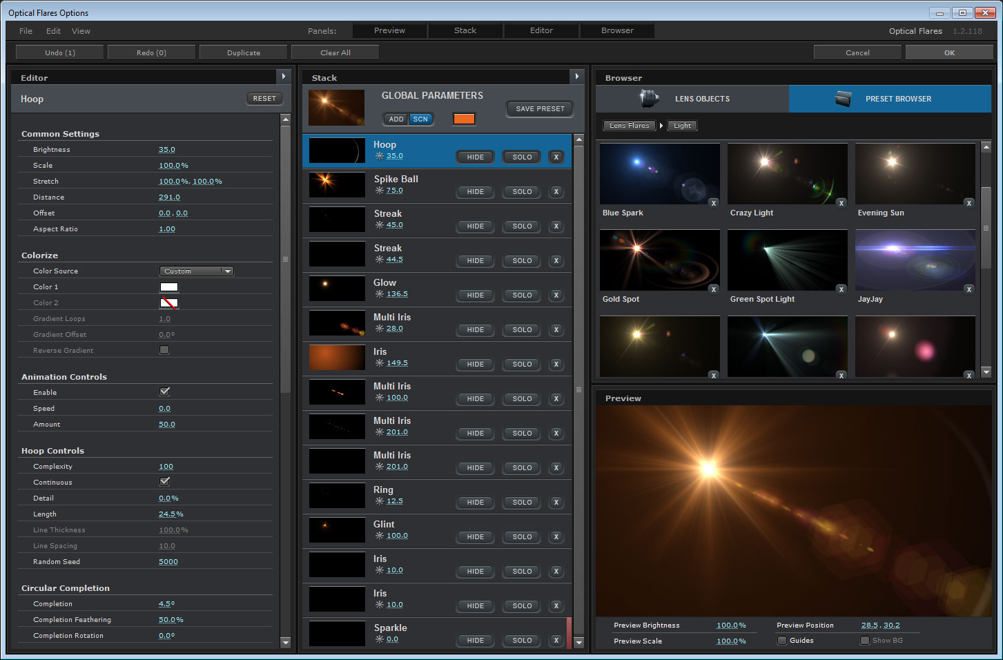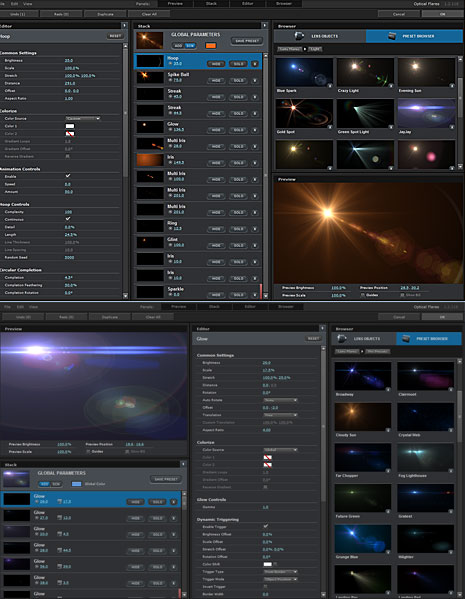 Basically the Optical flares update will now launch in Full-Screen mode, with resizeable control windows to take advantage of more screen space for editing and browsing presets. This update will be available for 64-bit and current 32-bit customers at no charge.
