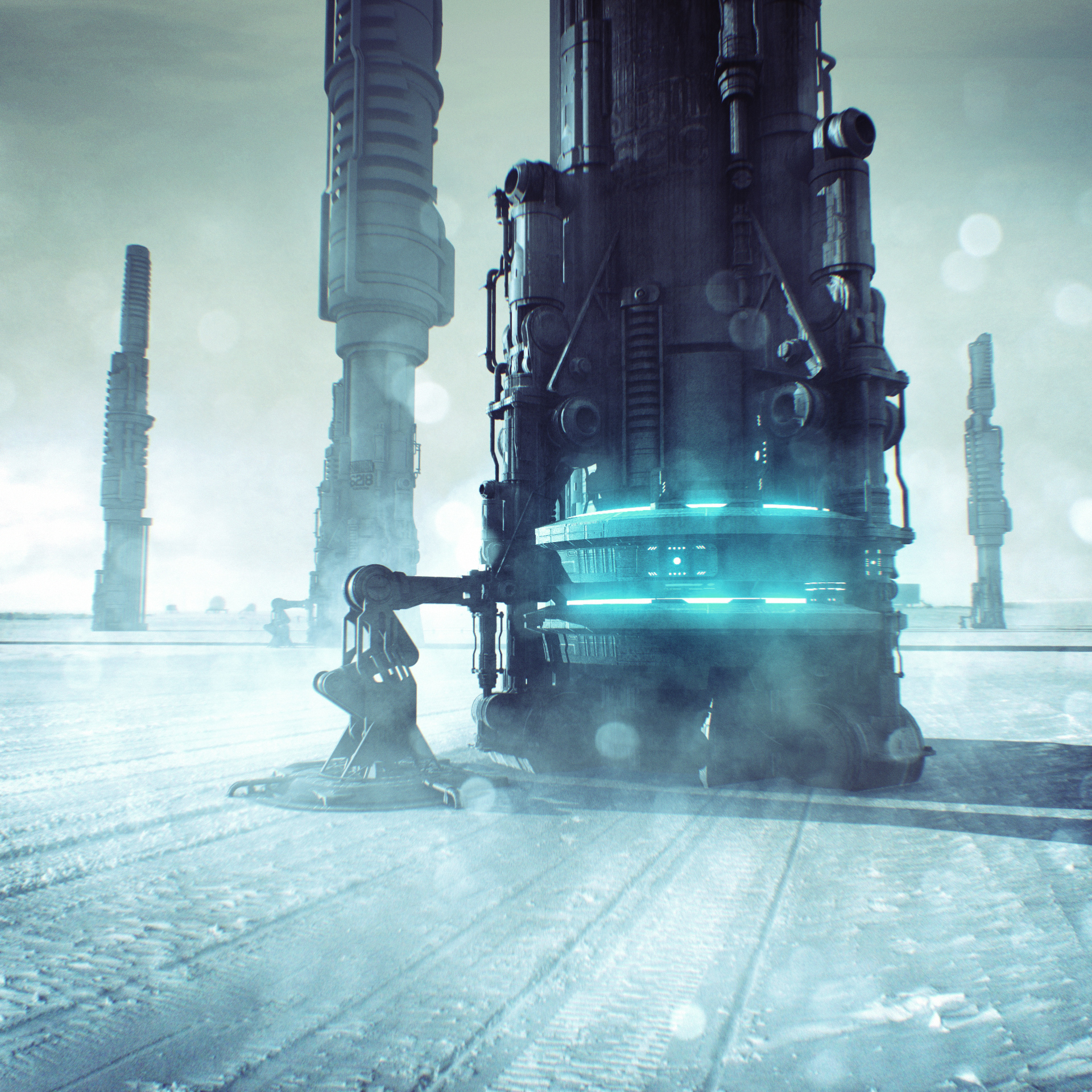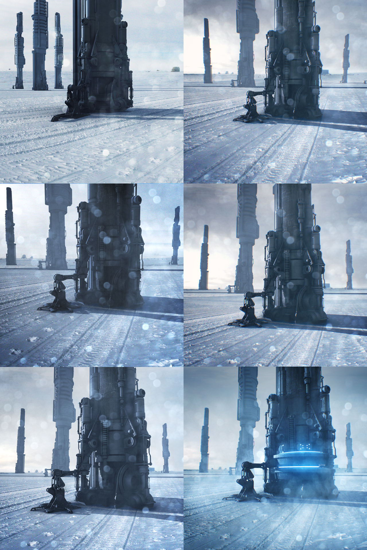 The lighting is similar to the recent rooftop tutorial. I used a parallel light with ray-trace Shadows and AO. Here are some progressions of the angle of the shot and a deviation from industrial to sci-fi. I think adding blue lights turns it into the future.
