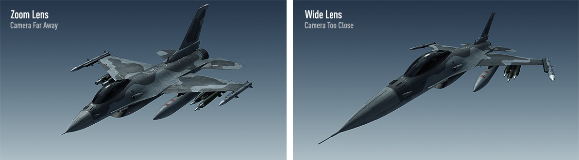 Generally the camera is at a safe distance inside another aircraft with a long zoom lens. This is important to avoid the perspective distortionyou get from wide angle lenses but it also helps to avoid the miniaturization of the models. For this I used an After Effects camera with a long zoom like 5,000-10,000 which is equivalent to a 100mm or 200mm.