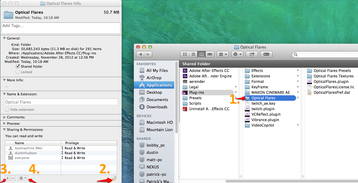 1) Right click the "Optical Flares" folder and choose "Get Info" 2) Go down to the lock box at the bottom to unlock - you'll need admin log-in details for this 3) Then click the + button to add the account that you want to give access to - change to read/preg_replace('/s+/s', '', 'write').'<'/span> 4) At the very bottom there is an options button. Click that and choose "Apply to enclosed items" Optical Flares for Nuke