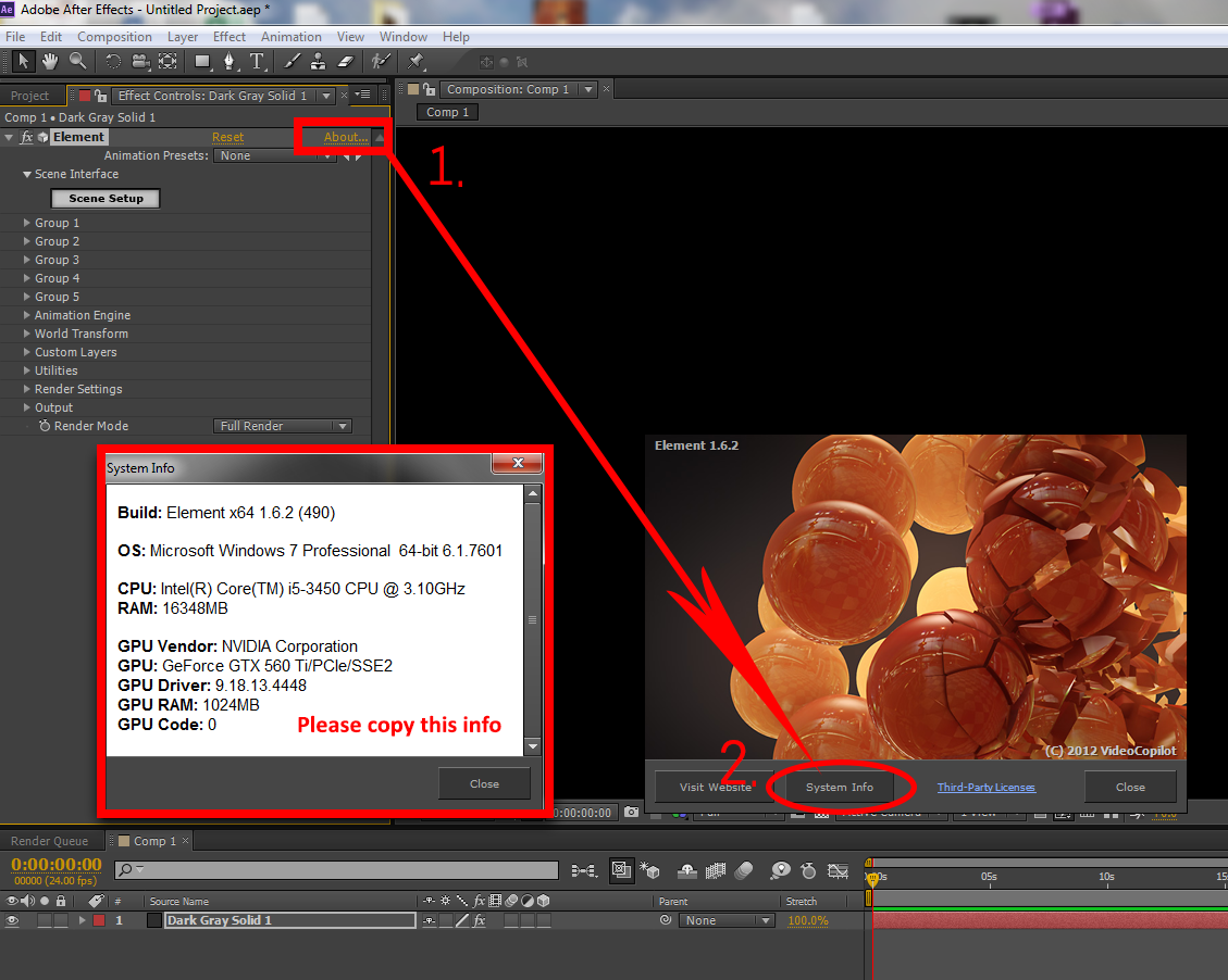 - Comps Larger than 1080p - This is somewhat normal for GPU's. Comps using Element that are larger than 1080p may cause problems if the GPU runs out of memory. One possible solution to lower memory requirements is to set the Element render settings before you start working. To do this you could do the following: 1. Turn on the Caps Lock to avoid rendering 2. Add Element to a layer 3. Turn Multi-Sampling down to 2-4 which will lower the memory requirements 4. To improve Anti-Aliasing (But slow render) turn on Super-Sampling INSTALLER ERRORS: